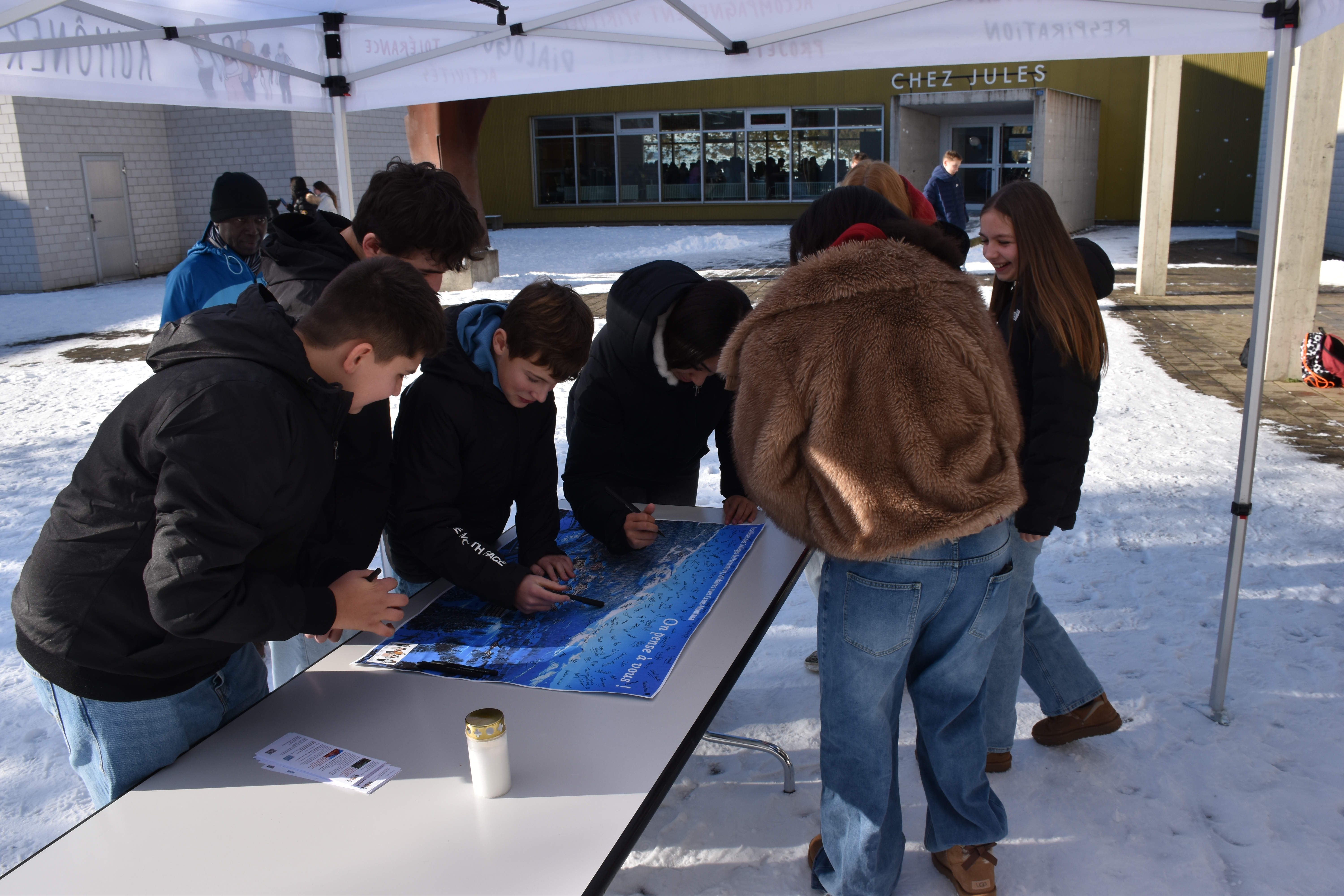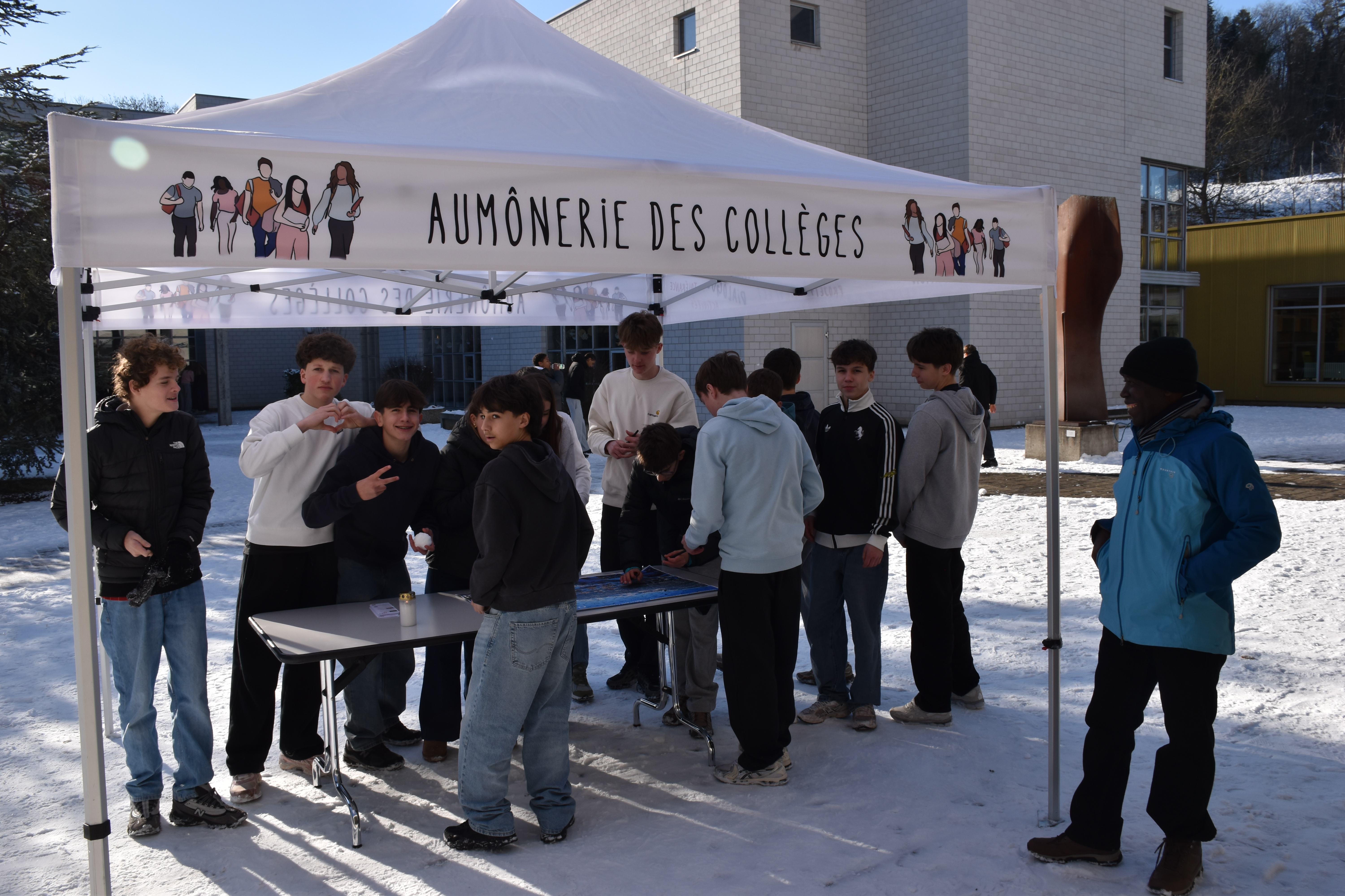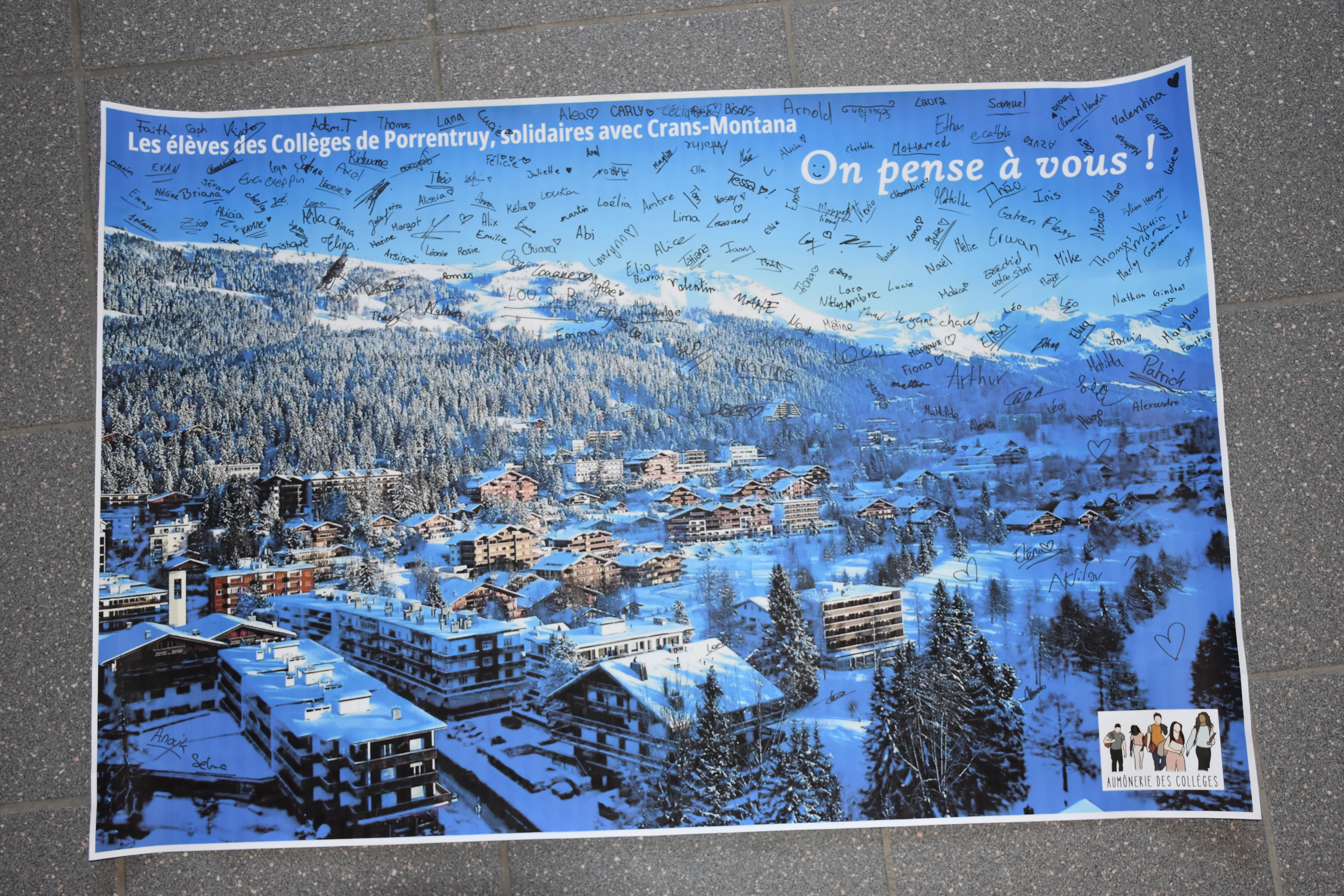 Nous sommes nombreuses et nombreux à être bouleversés par le drame de la nuit de Nouvel-An à Crans-Montana. Dans le cadre de l’aumônerie des Collèges à Porrentruy, près de 150 élèves des Collèges Stockmar et Thurmann ont tenu à manifester leur solidarité avec ce que vivent les familles des victimes ainsi que les blessés et leurs proches. Ils ont signé une affiche qui a été envoyée à Crans-Montana, en vue de la journée nationale de deuil de ce vendredi 9 janvier.