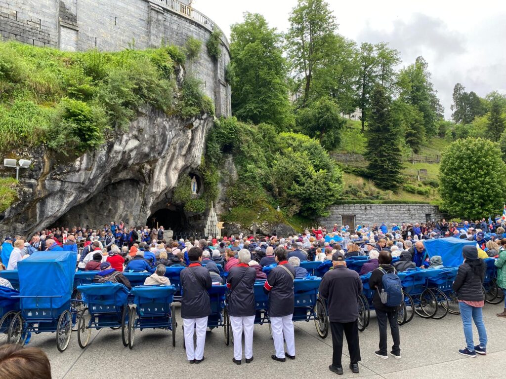 A Lourdes, nous nous mettons à disposition de l’Hospitalité de Notre-Dame de Lourdes afin d’accueillir les pèlerins et plus spécialement les pèlerins malades.